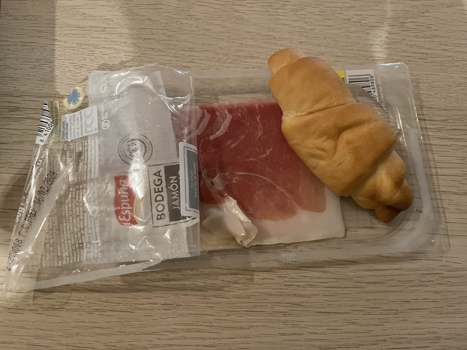 晩御飯に、生ハムと残しておいた機内食のパンを食べました。